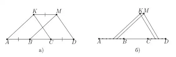 Подсказка На рисунке 8(а) показано два равных отрезка и на прямой . Докажем, что после любого аффинного преобразования образы этих отрезков будут иметь равную длину. Для этого сделаем дополнительные построения: параллельно прямой построим еще один отрезок , равный и . Заметим, что и параллелограммы, так как две их противоположные стороны равны и параллельны. После любого аффинного преобразования они останутся параллелограммами, а значит, для образов будут верны равенства и .