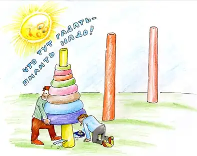 Рассмотрим ещё один классический пример на рекурсивные алгоритмы — игру «Ханойские башни», придуманную ещё в 1883 году Эдуардом Люка. Есть три стержня и 64 кольца́, нанизанных на них. В начале все ко́льца находятся на первом стержне, причём все ко́льца разного диаметра, и меньшие ко́льца лежат на бо́льших. За ход разрешается взять верхнее кольцо с любого стержня и положить на другой стержень сверху, при этом запрещается класть большее кольцо на меньшее. Цель игры состоит в том, чтобы переместить всю пирамиду с первого стержня на второй.