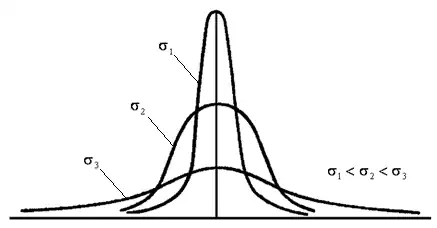 Следовательно, плотность вероятностей гауссова процесса полностью характеризуется спектральной плотностью, по которой можно определить значение дисперсии процесса. На рисунке 1 показана зависимость формы распределения Гаусса от среднеквадратичного отклонения.