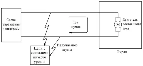 В этом примере источником шумов является искрение между щетками и коллектором двигателя. Канал связи состоит из двух частей: проводов, подведённых к двигателю, и излучения от этих проводов. Приёмником служит слаботочная цепь. В данном случае шумы источника и приёмника практически не устранимы. Поэтому помехи должны быть подавлены в канале связи. Можно блокировать шумы, проходящие по проводам за пределы экрана, или подавить излучение проводов.