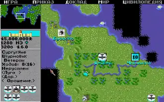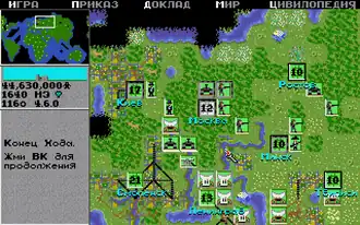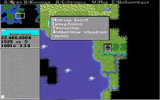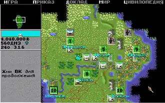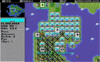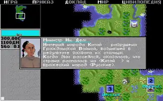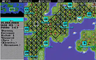 Здесь демонстрируются скриншоты русифицированной версии «Цивилизации» перевода Мисовца (Бийск); по сети гуляет несколько вариантов перевода, и к сожалению, не все корректно отображают текст, в том числе в окне сохранения. Есть отличия в описаниях юнитов и строений, подсказках, однако общая логика работы остаётся неизменной и ничем не отличается от английской.