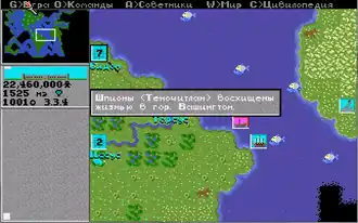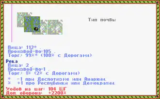 В каждом окне доступно больше возможностей, чем можно ожидать от столь скромного по размеру продукта, и частично они реализованы нажатием единичных клавиш, в справке (Цивилопедия) этого нет. Так, при щелчке по области, где отображается замок правителя, мы можем рассмотреть его детальнее; миникарта в левом верхнему углу позволяет быстро перемещать фокус по планете; правый щелчок по местности вызывает показ её свойств (внимание: если выделен юнит, то такой щелчок с ним по соседству вместо этого переместит его на эту клетку).