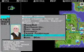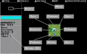Итак, собственно после запуска программы предстоит выбрать тип монитора, управления и озвучки программы. Как правило, последовательность 1 4 1 даёт управление клавиатурой и мышью с обычным монитором, но если звуковая карта при этом не сработает (бывает всякое), то можно использовать для озвучки PC speaker, набрав 1 2 1. Далее идёт меню загрузки сохранённой игры, создания нового мира, игры (тип местности запоминается и будет использован и при следующем запуске), игры на случайной карте нового мира, или игры на карте Земли (более предсказуемо), уровня сложности. Если не препятствовать пробелом или вводом, программа покажет длинное интро с развитием планеты. Обратите внимание, что можно не только менять имя вождя, но и название народа, для чего при выборе в списке нужно нажать Esc и напечатать свой вариант; однако цвет и предлагаемые названия городов останутся без изменений (то есть желаемые имена придётся вводить самому). Всего можно играть с 6 соперниками (7 цивилизаций), выбирая один из 14 народов. Ещё одним соперником являются варвары; они не имеют столицы, с ними нельзя вести переговоры и создавать посольства. Варвары не интересуются наукой.