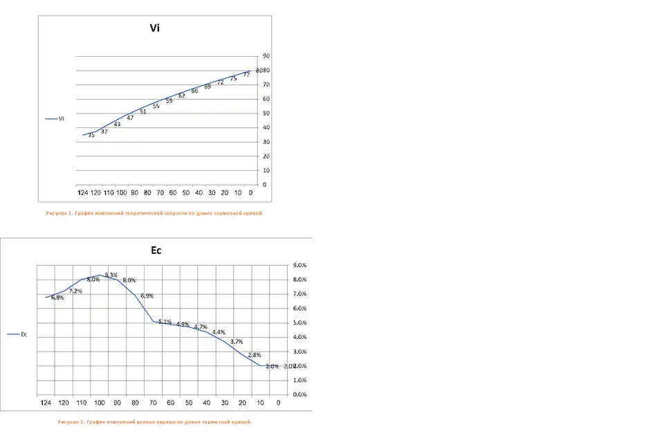 Максимальный уклон виража на скоростях меньше 80 км/ч равен 10% и не изменяется на всем протяжении тормозной кривой.