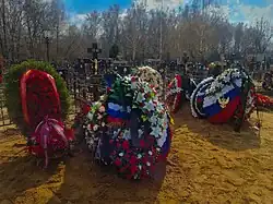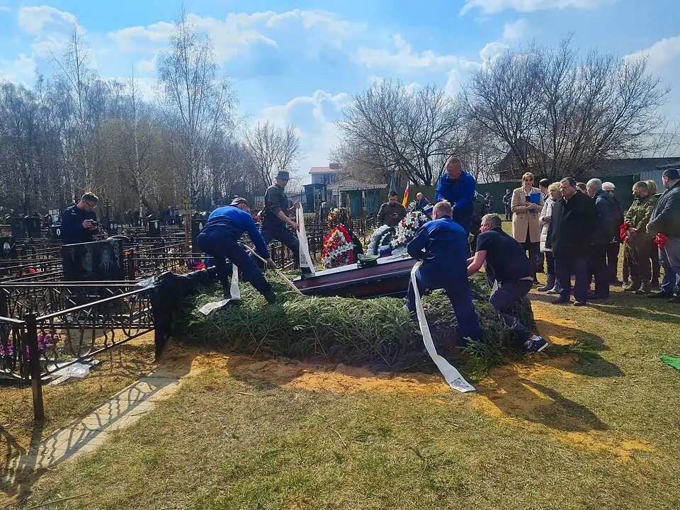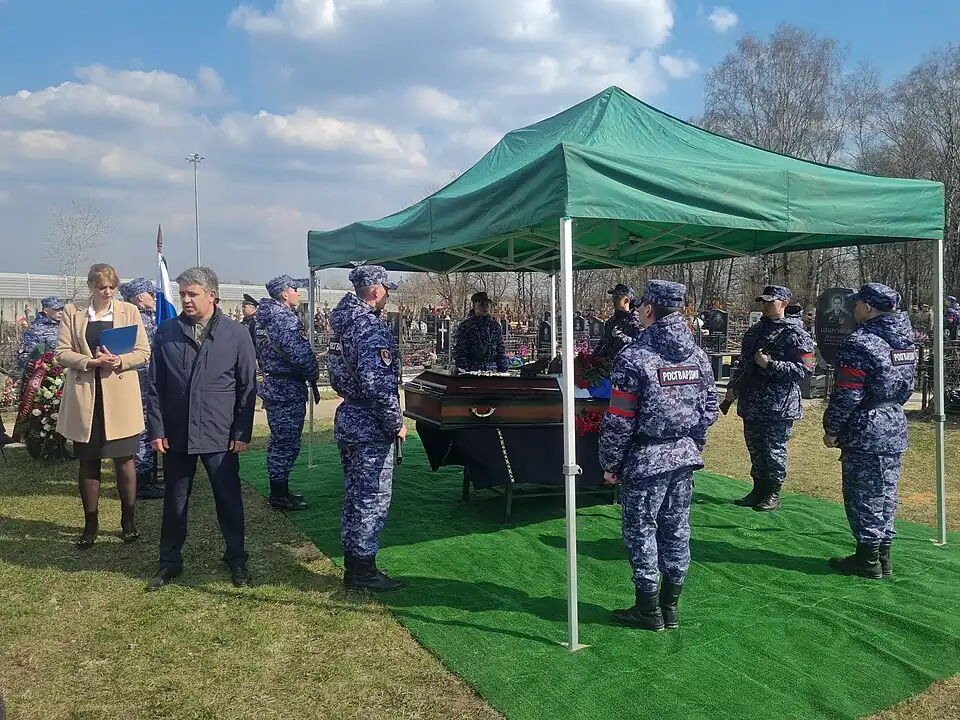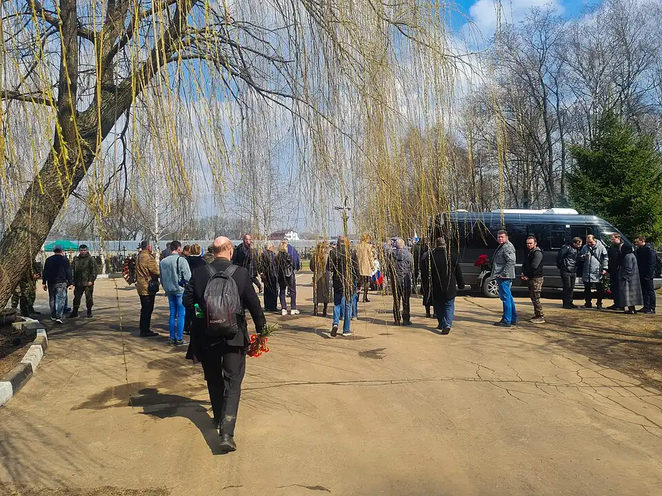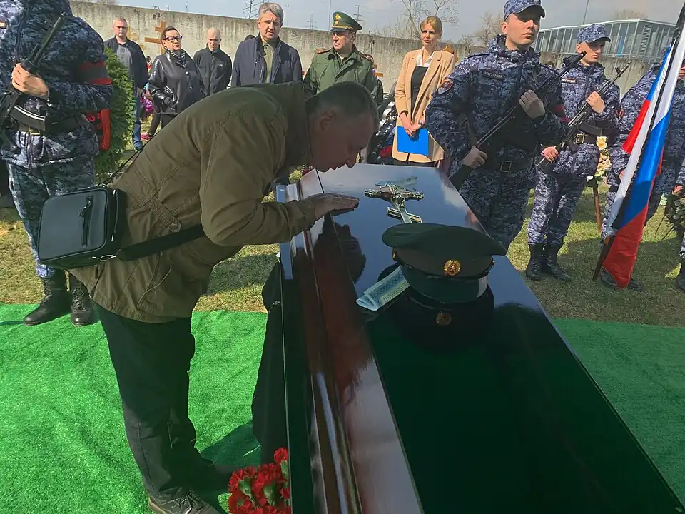 11 апреля 2023 года состоялось отпевание в Храме Успения Пресвятой Богородицы в Жилино, Московской области. Похоронен с воинскими почестями на Токарёвском кладбище (городской округ Люберцы Московской области). На церемонии присутствовали официальные лица: представители городской администрации и министерства обороны, общественные деятели: лидер движения «Новороссия» Игорь Стрелков и военный историк Михаил Поликарпов, а также викимедийцы Владимир Медейко, Дмитрий Рожков и Leonrid.