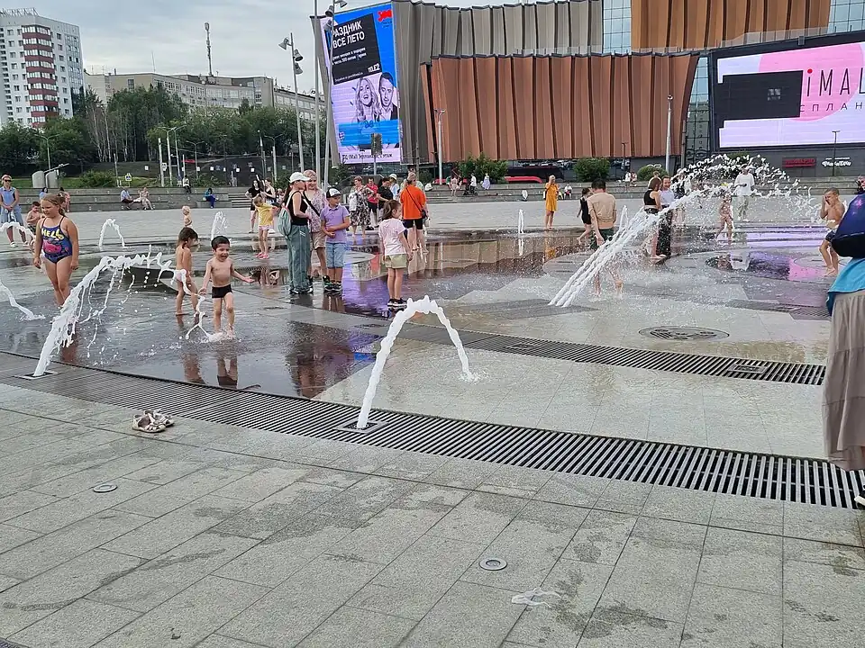 Струи бьют прямо из-под земли, и площадка становится местом игры детей, которые могут избежать перегрева благодаря воде.