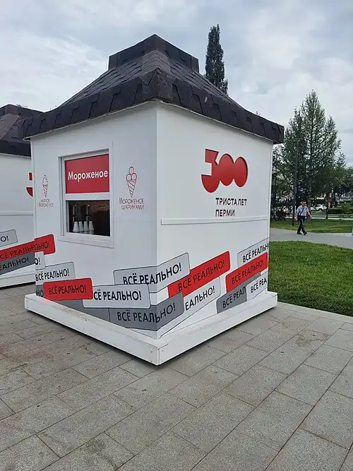 На центральных улицах и туристических площадках разместились специальные туристские центры, посвященные 300-летию Перми, где можно приобрести тематические сувениры.