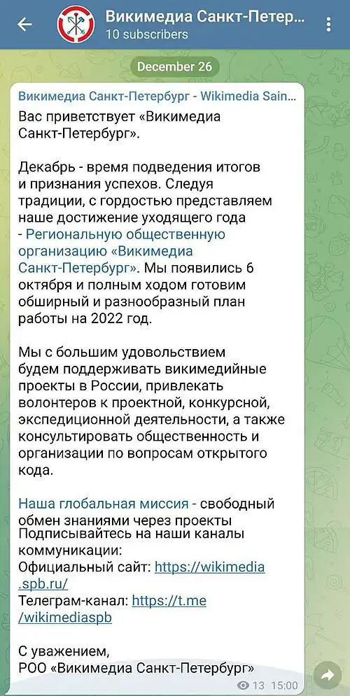 Вчера, 26 декабря 2021 в телеграм-чатах викимедийной тематики было объявлено о появлении новой российской НКО — Региональной общественной организации «Викимедиа Санкт-Петербург».