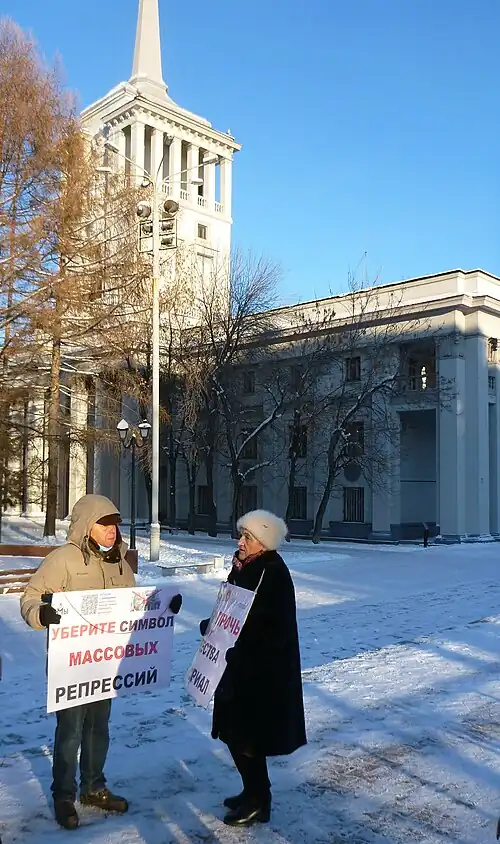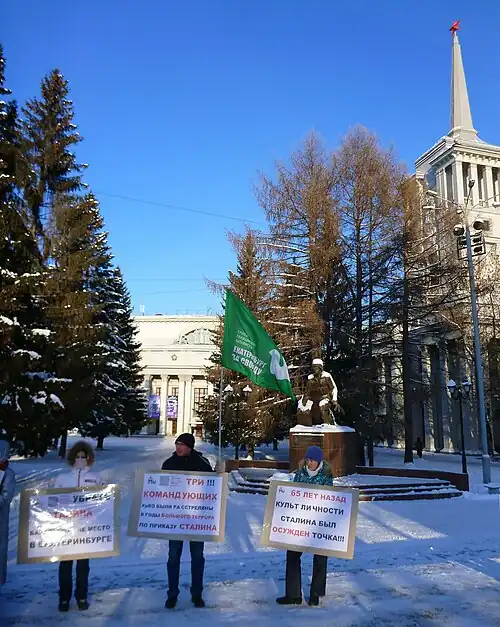 В Екатеринбурге 25 декабря 2021 года прошёл согласованный массовый пикет против барельефа Сталина на Центральном окружном доме офицеров. В акции приняли участие представитель Левого социалистического действия Игорь Филиппов и сын репрессированного Владислав Тарик.