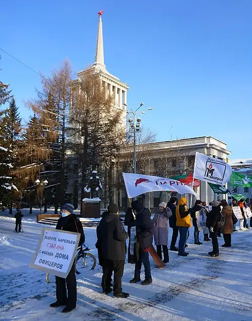 Недавно в Екатеринбурге провели реставрационные работы на фасаде Центрального окружного дома офицеров. В результате были отремонтированы скульптуры и восстановлен барельеф Сталина. Уральский Мемориал и местные организации демократической направленности (ПАРНАС и Екатеринбург за свободу) провели массовый пикет против барельефа.