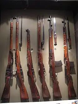 Слева направо: 1) винтовка Мосина обр. 1891/1930; 2) винтовка Мосина обр. 1891/1930 со штык-ножом обр. 1891/1930; 3) карабин Мосина обр. 1938; 4) драгунская винтовка Мосина со штык-ножом Кабакова-Комарицкого; 5) АВС-36 со штык-ножом; 6) СВТ-38 со штык-ножом