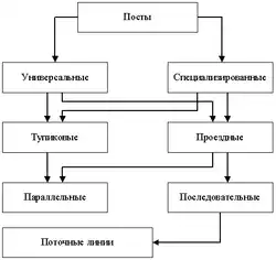 Работы на постах могут быть организованы параллельно, либо образовывать поточную линию.