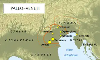 Главные города — Атесте (совр. Эсте) и Патавиум (совр. Падуя). Венеты были союзниками римлян в их борьбе с галльскими племенами (IV век до н. э.) и во время Второй Пунической войны (218—201 гг. до н. э.) против карфагенского полководца Ганнибала. В начале II века до н. э. началась римская колонизация области расселения венетов, которая с 183 г. до н. э. вошла в состав римской провинции Цизальпийская Галлия. В 89 г. до н. э. венеты получили права латинского гражданства, в 49 г. до н. э. — римского гражданства. После реформ Октавиана Августа земли венетов вошли в Регион X (Венетия и Истрия) италийских владений римлян.