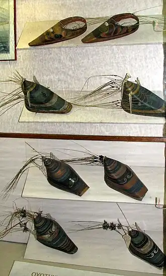 Знатных людей хоронили вместе с рабами в пещерах, у входа ставили раскрашенный столб или подвешивали тела покойных в корзинах между двумя столбами.