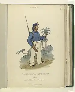 Регулярная армия республиканцев состояла преимущественно из индейцев. Доля индейцев среди высшего командного состава была также велика[33]. Народное сопротивление было преимущественно партизанским. Партизаны играли решающую роль в 18631866 гг. Регулярная армия в этот период также действовала партизанскими методами. Такими соединениями были «армия центра» и армия генерала Порфирио Диаса[34]. Партизанскими частями командовали в основном кадровые офицеры, но встречались также и командиры из числа штатских людей. Среди руководителей партизан выделялись Рамон Корона, Николас Ромеро, Николас Регулес, Висенте Рива Паласио[35].