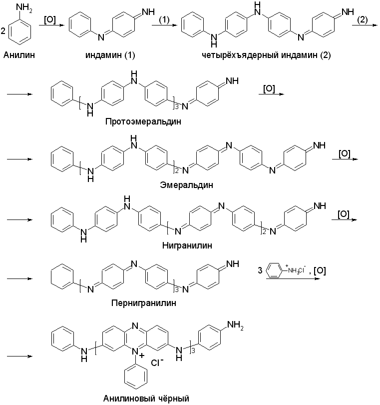 Образование Анилинового чёрного (Пигмента глубоко-чёрного) проходит через ряд стадий: образование индамина из двух молекул анилина, дальнейшее «удвоение» в четырёхъядерный индамин и соединение двух молекул последнего в восьмиядерный индамин с одним хиноидным ядром (фиолетовый Протоэмеральдин).