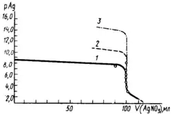 Кривые титрования строятся в координатах р Ag — V, где р Ag — логарифм концентрации катионов серебра, взятый с обратным знаком, а V — это объем титранта. В качестве рабочего раствора, как правило, выступают нитрат серебра(I), тиоцианат калия и раствор хлорида натрия.