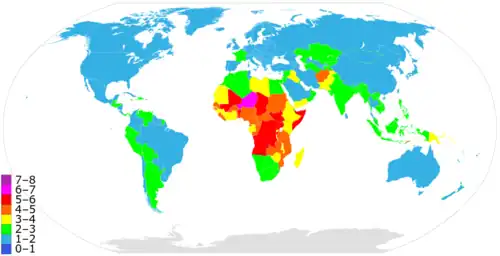 Карта стран мира по суммарному коэффициенту рождаемости по состоянию на 2020 год. Самый высокий на Земле суммарный коэффициент рождаемости наблюдается в основном в странах Африки южнее Сахары.