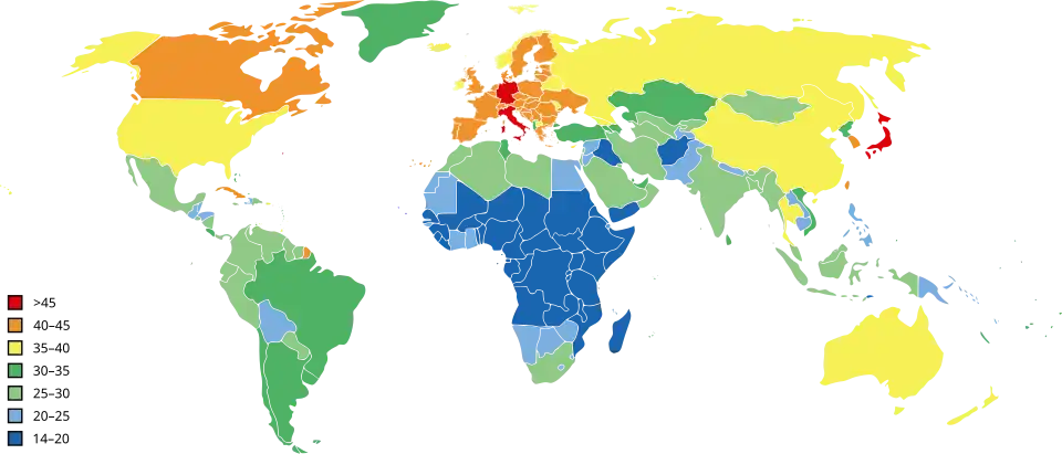 Карта медианного возраста (от и до) в разных странах по состоянию на 2018 год. Самое молодое население Земли в основном сосредоточено в странах Африки южнее Сахары.