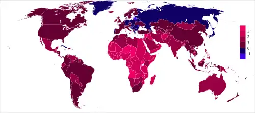 Карта стран мира по темпу роста населения в процентах с учётом рождаемости, смертности, иммиграции и эмиграции в 2018 году. Самый высокий темп роста населения Земли наблюдается в основном в странах Африки южнее Сахары.