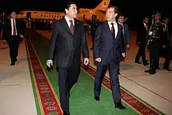 Гурбангулы Бердымухамедов и Дмитрий Медведев недалеко от корпуса для приёма ВИП.