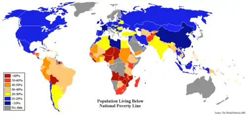 Наиболее высокая абсолютная бедность по данным ООН на 2004 год, исходя из установленной национальной границы, наблюдалась на Мадагаскаре — 71,3 %, Сьерра-Леоне — 70,2 %, Мозамбике — 69,4 %. Если же за границу бедности взять 1 доллар в день (такой показатель использует ООН для развивающихся стран), то наиболее высокая бедность по данным на 2005 год отмечается в Нигерии (70,8 %), ЦАР (66,6 %) и Замбии (63,8 %).[16]