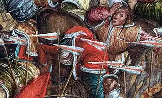 Ранние факты использования бело-красно-белого флага на территории Беларуси фиксируются 1514-м годом в виде флажков конницы Великого княжества Литовского в битве под Оршей на живописном полотне начала XVI века[10]. На картине имеются примеры как трёхполосных бело-красно-белых прапорцов, так и белых прапорцов c красным крестом Святого Георгия, тем не менее некоторые белорусские специалисты считают неправильным трактовать эти флажки как прообраз бело-красно-белого флага[11], особенно с учётом спорности атрибуции изображённых воинов[12]. Достоверность изображённого на картине также принимается не всеми исследователями[13].