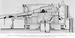 Схема ранней башенно-барбетной установки с купольным прикрытием орудия.