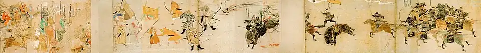 - 19 ноября 1274 (20-й день 10-й луны 11-го года Бунъэй) — Битва годов Бунъэй (яп. 文永の役 бунъэй но эки) — высадка татаро-монгольских войск хана Хубилая в бухте Хаката (яп. 博多湾) возле современного города Фукуока на острове Кюсю. После высадки и нескольких вооруженных столкновений, захватчики отступили, чтобы провести ночь на корабле. Ночью случился шторм, потопивший несколько кораблей, что вынудило вражеский флот отступаить в Корею, несмотря на свой первоначальный успех[10]. После битвы длиной в день был сожжен дотла храм Хакодзаки (яп. 筥崎宮)[11]. По данным «Нихон одай итиран», захватчики потерпели поражение из-за нехватки стрел[9];
