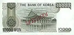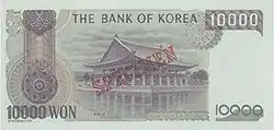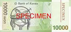 4. 1 2 Brief History of current Korea notes in circulation; 10,000 won note (Flash и HTML). Банк Кореи. Дата обращения: 10 сентября 2008. Архивировано из оригинала 7 мая 2008 года. (англ.)