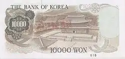 ₩10 000 171 × 81 мм Коричневый Седжон Великий, Роза Шарона Кынджонджон в Кёнбоккуне 12 июня 1973 10 ноября 1981 Серия I (가) В Японии[4]