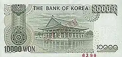₩10 000 171 × 81 мм Зелёный Седжон Великий, водяные часы Павильон Кёнхору в Кёнбоккуне, Роза Шарона 15 июня 1979 12 мая 1993 Серия II (나) В Японии[4]