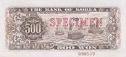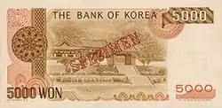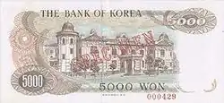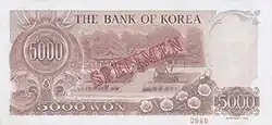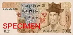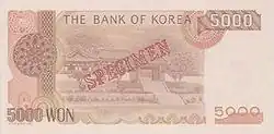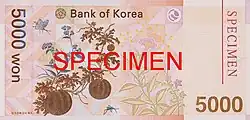 3. 1 2 Brief History of current Korea notes in circulation; 5,000 won note (Flash и HTML). Банк Кореи. Дата обращения: 10 сентября 2008. Архивировано из оригинала 27 сентября 2007 года. (англ.)