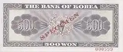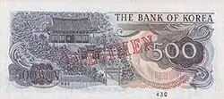 ₩500 159 × 69 мм Зелёный и розовый Ли Сунсин, Кобуксон Гробница Ли Сунсина Нет 1 сентября 1973 12 мая 1993 Серия III (다)