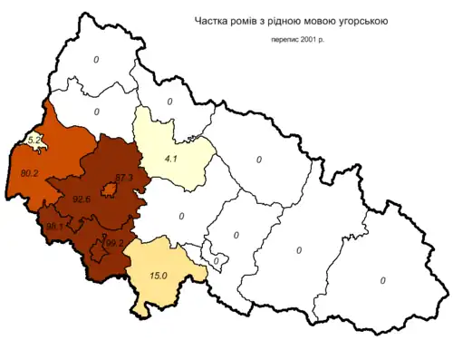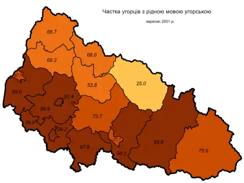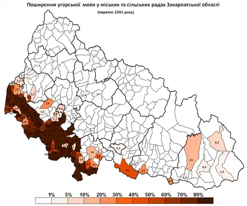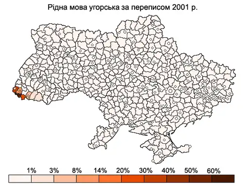 По переписи 2001 года венгерский назвали родным 156 566 человек[7], в том числе 95,4% (149 431) этнических венгров. В Закарпатской области венгерский назвали родным 97% этнических венгров и 62% цыган, а также значительная доля словаков и чехов[8].