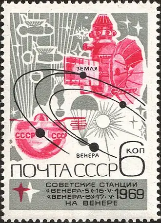 ![]() Почтовая марка СССР. 1969. «Венера-5», «Венера-6» | |