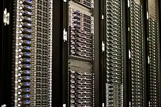 Википедия в настоящее время работает на выделенных кластерах серверов Linux (в основном Ubuntu[67][68]), с несколькими машинами OpenSolaris для ZFS. Вики-проекты Фонда Викимедиа, самым крупным из которых является Википедия, по состоянию на март 2013 года поддерживались работой нескольких кластеров, состоящих из 974 серверов[69].
