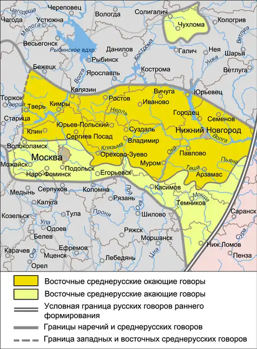 Переселения носителей владимирско-поволжских говоров с XVII века в Среднее Поволжье[6], Прикамье[12] и другие восточные районы страны привели к формированию различных говоров позднего заселения со среднерусской основой.