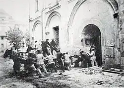 Прежде всего, мы по пути зашли в женский Вознесенский монастырь. Здесь уже было полное разрушение. В храме Св. Великомученицы Екатерины насквозь пробита артиллерийским снарядом стена верхнего карниза и верхний свод храма[18].