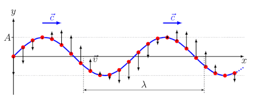 Однако совокупность колебаний в соседних точках пространства происходит не случайно, а особым образом, так, что в соседних кадрах анимированной картинки (в каждый последующий момент времени) график зависимости физической величины от координаты (синяя линия) совпадает с самим собой, отличаясь только сдвигом вправо (физическая величина удовлетворяет волновому уравнению). Именно такое поведение физической величины в пространстве и во времени называют волной. В данном примере это бегущая волна с гармонической временной зависимостью, распространяющаяся в однородной среде без потерь в направлении слева направо. Показаны векторы мгновенной скорости изменения физической величины для некоторых точек пространства , длина волны , амплитуда колебаний и направление распространения волны .