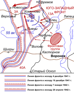 И. В. Сталин тогда с особым вниманием присматривался к району Воронежа. Возможно, он предполагал, что, прорвавшись сюда, немецкие войска форсируют Дон и начнут обходное движение в тыл Москвы. Стремясь упрочить положение на воронежском направлении, Ставка приказала выдвинуть на левый берег Дона три армии — 3, 6 и 5-ю резервные, которые были затем переименованы соответственно в 60, 6 и 63-ю армии. Они заняли оборону от Задонска до Клетской. Одновременно Брянскому фронту передавалась и только что сформированная 5-я танковая армия опытного и храброго генерала А. И. Лизюкова для контрудара по северному флангу противника, наступающего на Воронеж. Советское стратегическое руководство и Генеральный штаб полагали, что если начать контрудар без промедления, то эта армия совместно с 17-м танковым корпусом фронта сумеет изменить обстановку в нашу пользу. Кроме того, фронту передавался 18-й танковый корпус.