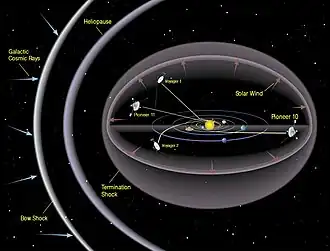На определённом расстоянии скорость солнечного ветра резко падает и перестаёт быть сверхзвуковой. Область (практически поверхность), в которой это происходит, называется границей ударной волны (англ. termination shock или termination shockwave). Это и есть граница, которую пересекли «Вояджеры». Можно считать её границей внутренней гелиосферы. По некоторым определениям, гелиосфера здесь и кончается.