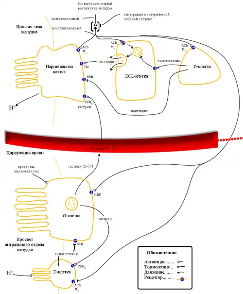 Секреция открытых клеток желудка существенным образом зависит от кислотности желудочного содержимого. рН от 5 до 7 стимулирует гастриновую секрецию, значения рН ниже 5 её тормозят, а при рН ниже 1,7 она полностью подавляется. Антральные D-клетки также реагируют на кислотность: максимальная секреция соматостатина, являющегося ингибитором секреции соляной кислоты, происходит при рН=1, а подавляется при значениях рН выше 3.[4]