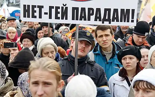 Оживлённые дискуссии со стороны представителей власти, прессы, общества в целом, а также внимание мировой общественности вызвали правозащитные акции Московского гей-прайда, которые с мая 2006 года ежегодно проводились в Москве правозащитным проектом GayRussia.Ru[2]. В 2008 году движение Московского гей-прайда объединилось с белорусскими ЛГБТ-активистами, учредив совместный Славянский гей-прайд, мероприятия которого проходят в Москве и Минске. В 2010 году к российскому движению гей-прайда присоединились ЛГБТ-активисты из Петербурга, впервые проведя Санкт-Петербургский ЛГБТ-прайд[3].