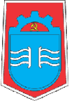 Герб был утверждён 30 июля 1971 года решением N344 исполнительного комитета городского совета. В красном щите — синий щиток, увенчанный половиной шестерёнки, в котором три разомкнутых волнистых нитяных пояса. В половине шестерни — золотые серп и молот. Пояса означают реку Днепр, которую пересекает мост в топографическом изображении. Герб имеет узкую серебристую кайму. Автор — Л. Сидоренко.