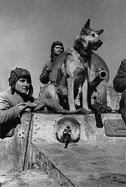 Другая овчарка по кличке Джульбарс, питомец экипажа советского бронеавтомобиля БА-10: старший сержант Е. П. Эндрексон, сержант В. П. Поршаков, Т. Д. Деренко. Южный фронт.