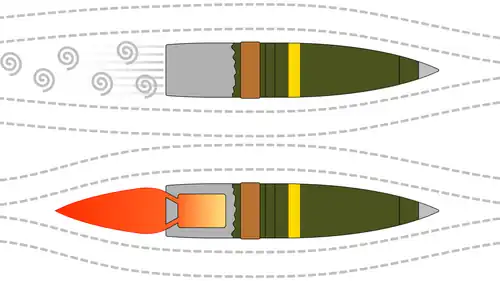 Наибольшее сопротивление воздуха на артиллерийский снаряд оказывает процесс, происходящий около его носовой части — выталкивание воздуха с его пути и возникающая на сверхзвуковых скоростях ударная волна. Путем выбора надлежащей формы снаряда удается минимизировать лобовое сопротивление. Тем не менее, еще одним существенным источником аэродинамического сопротивления является область разреженного воздуха, образующаяся за донной частью снаряда. Однако эту часть аэродинамического сопротивления уже трудно устранить только путём изменения формы снаряда, поскольку невозможно изменить сколь-нибудь существенно острый передний конец снаряда и широкий плоский задний конец, воспринимающий давление пороховых газов при прохождении ствола орудия.