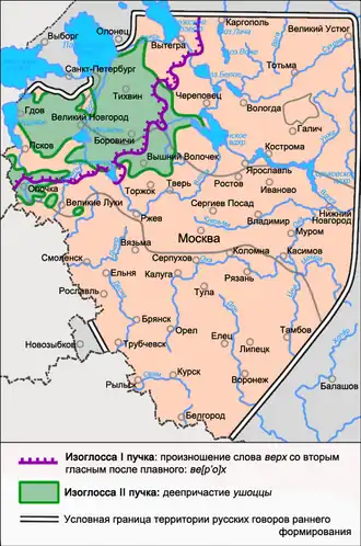 Авторы диалектного членения русского языка 1964 года связывают происхождение сочетания ареалов ряда диалектных явлений, которые группируются, во-первых, в области Новгородской земли раннего периода (до XIV века) и, во-вторых, в области, охватывающей помимо исконной новгородской территории районы поздней колонизации, с древненовгородским диалектом[42]. Данные сочетания ареалов были выделены в числе особых объектов в классификации русских диалектов, имеющих вспомогательное значение, как северо-западная и северная диалектные зоны. Показательно, что ареал северной диалектной зоны, охватывающий почти все говоры северного наречия, не включает в себя говоры Костромской группы, генетически восходящие к ростово-суздальскому диалекту[43][44].