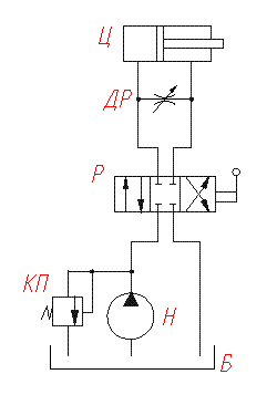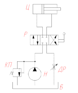 Гидросистема с параллельно включённым дросселем: Р — гидрораспределитель; Н — насос; Ц — гидроцилиндр; Б — гидробак; КП — предохранительный клапан; ДР — гидродроссель