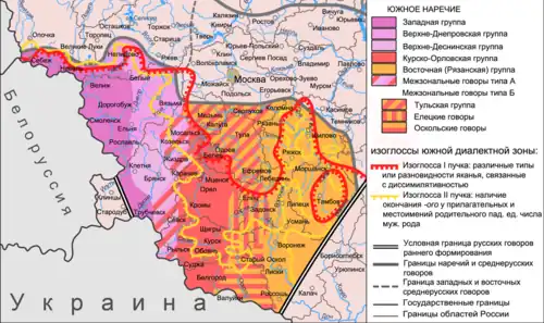 Кроме того существует ряд диалектных черт, общих для елецких и оскольских говоров и неизвестных в говорах Тульской группы[7]. К ним относится ряд черт курско-орловского происхождения, которые распространены преимущественно в западных частях ареалов елецких и оскольских говоров: